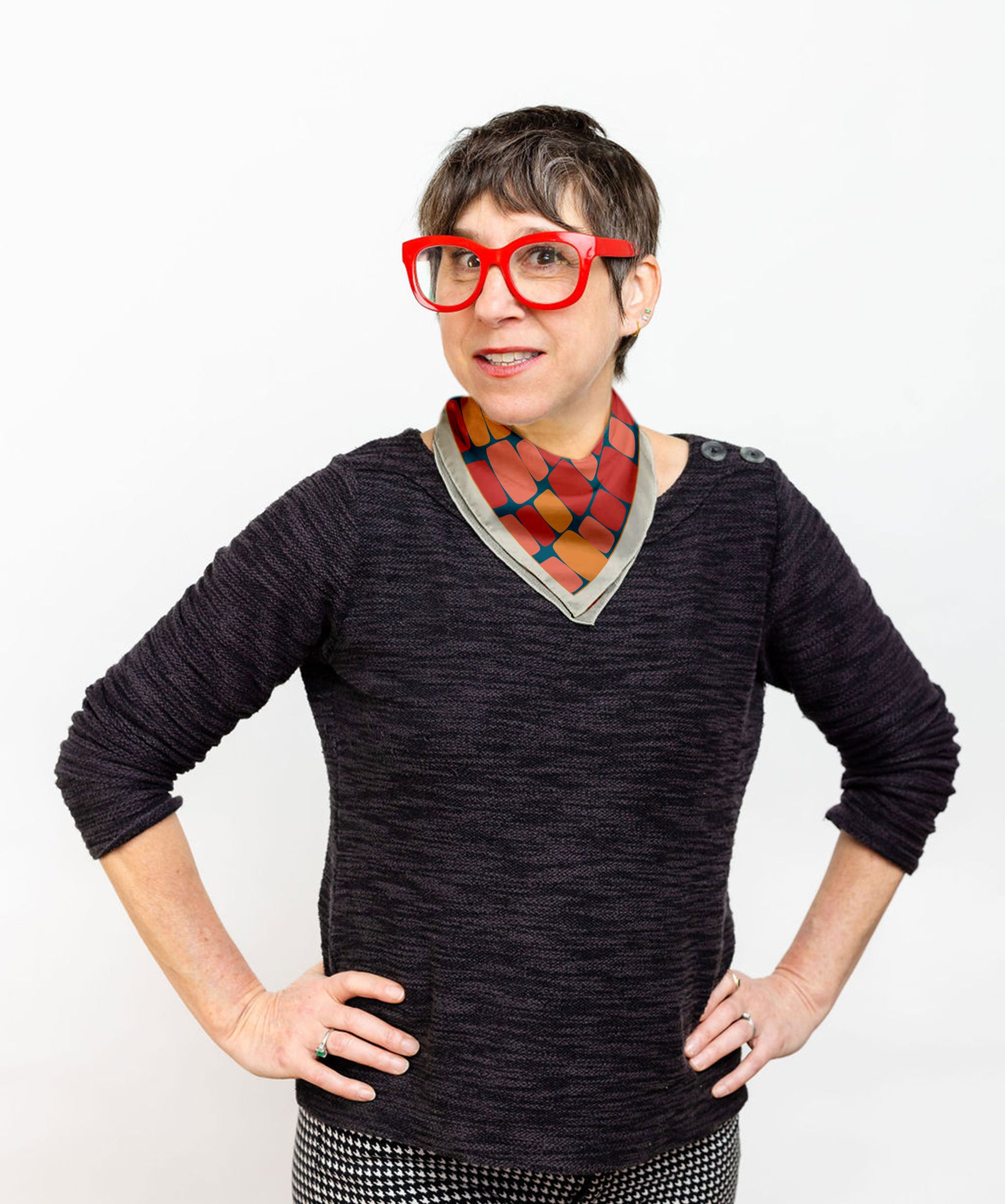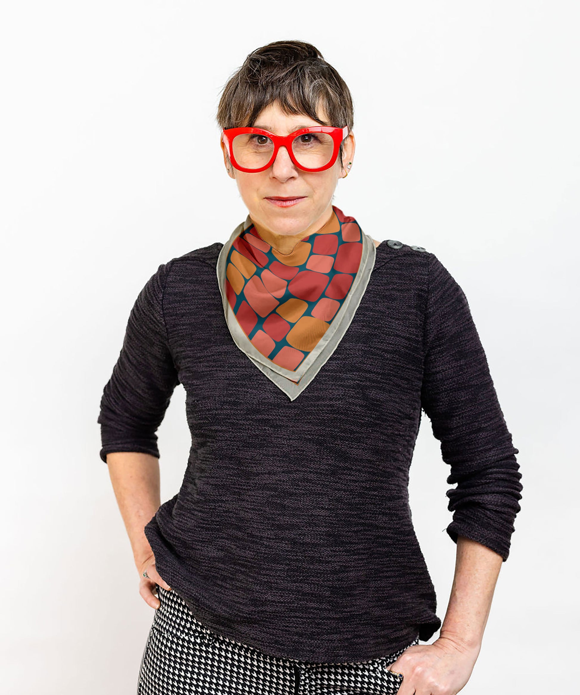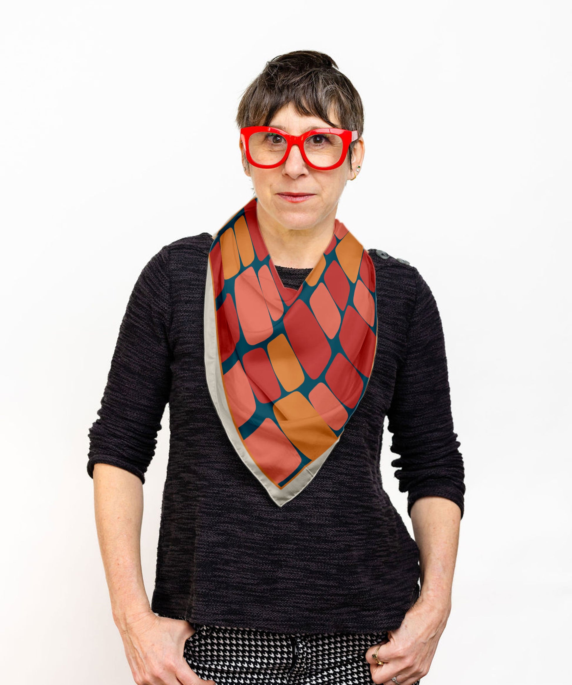 Meet my mid century neckerchief, a 100% silk retro print scarf with abstract shapes in red, orange, pink and blue.