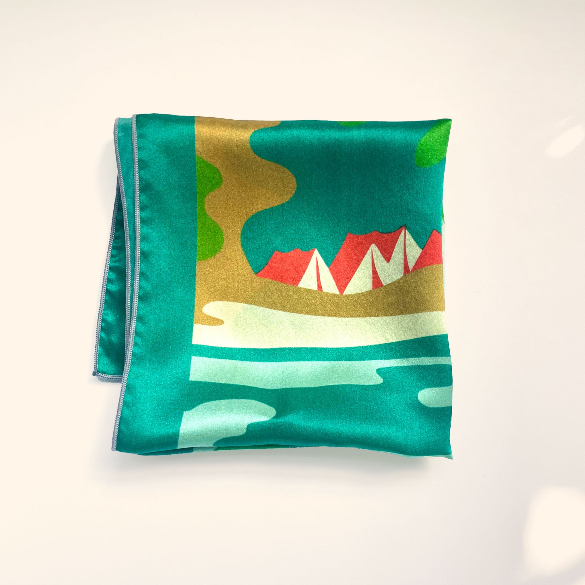 Private Listing for Laura - Camp - square silk scarf. Retro lakeside camping scene in blues and greens