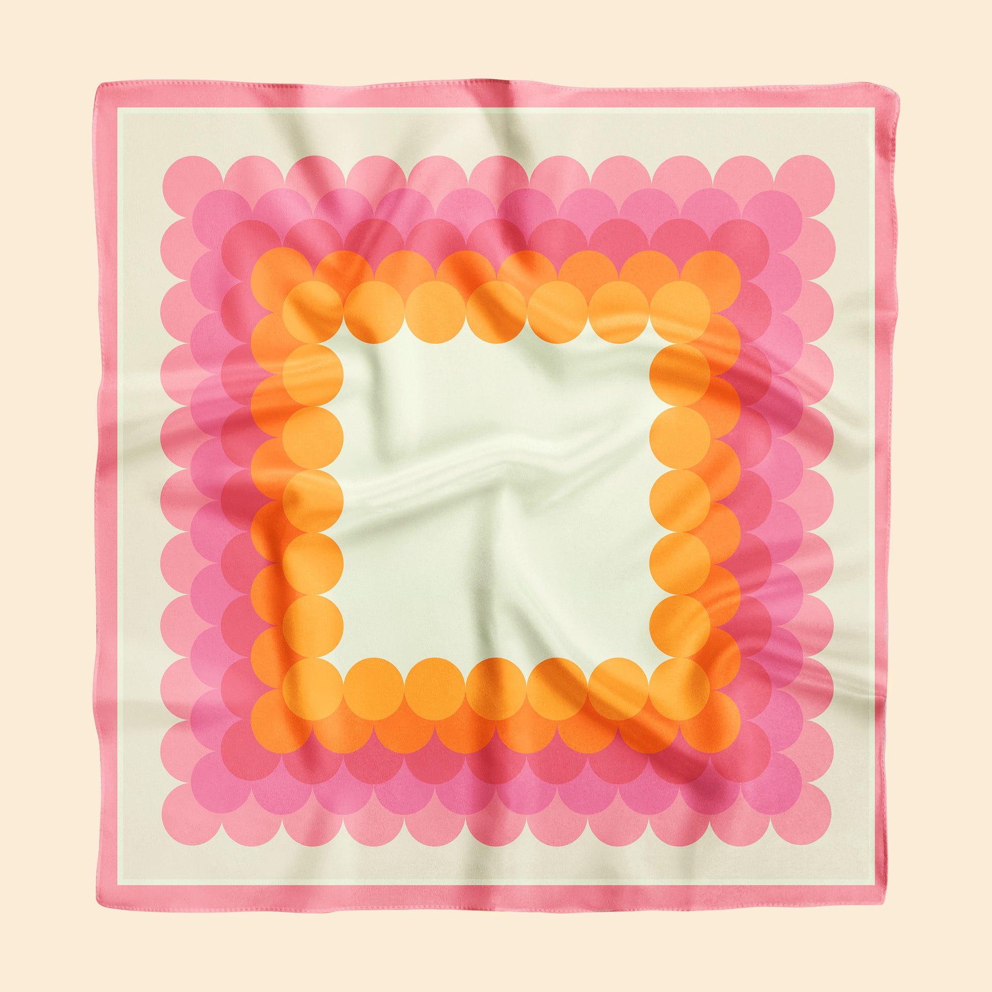 Meet my mid century Linear Dots silk scarf, a retro 100% silk neckerchief with geometric mod pattern in pink and orange.