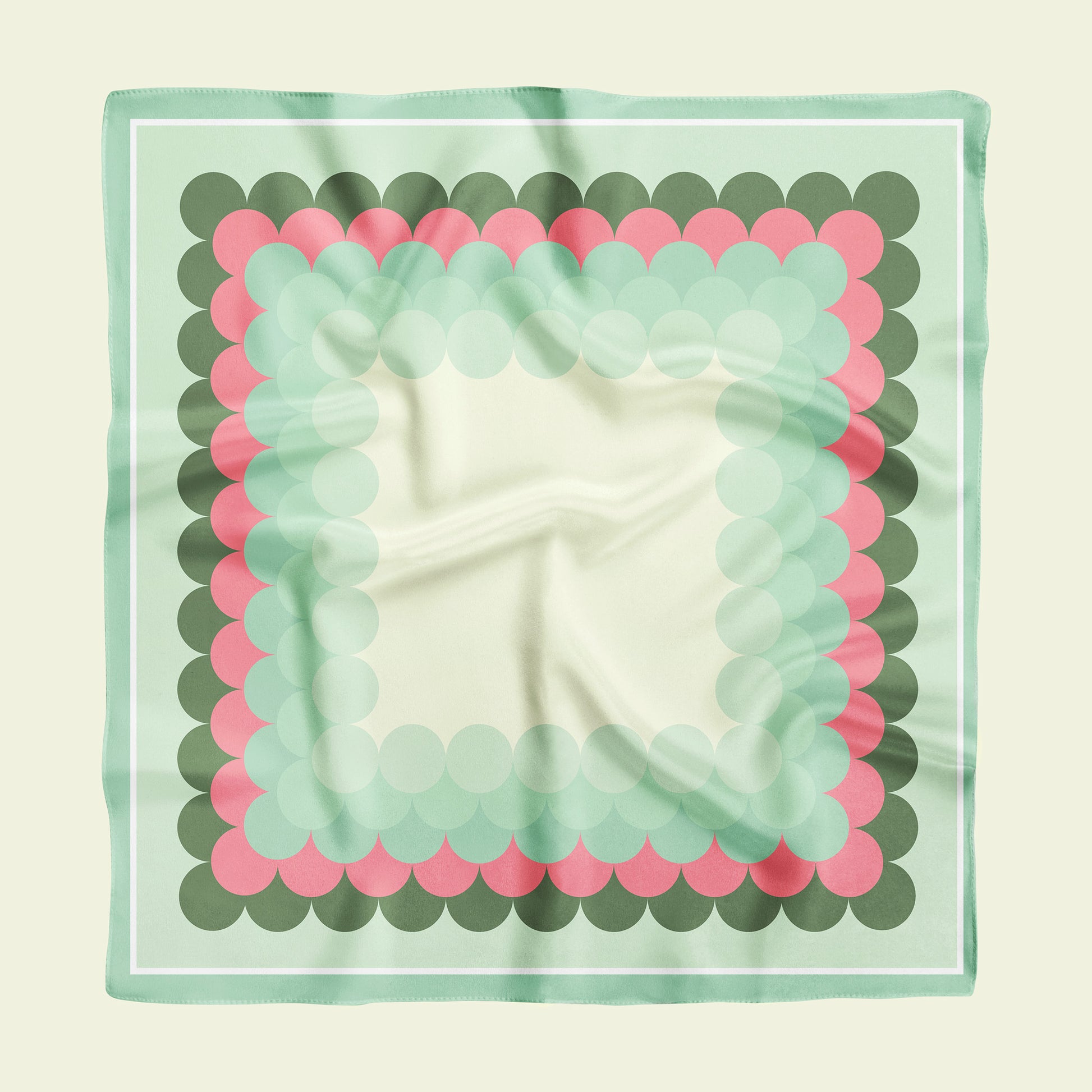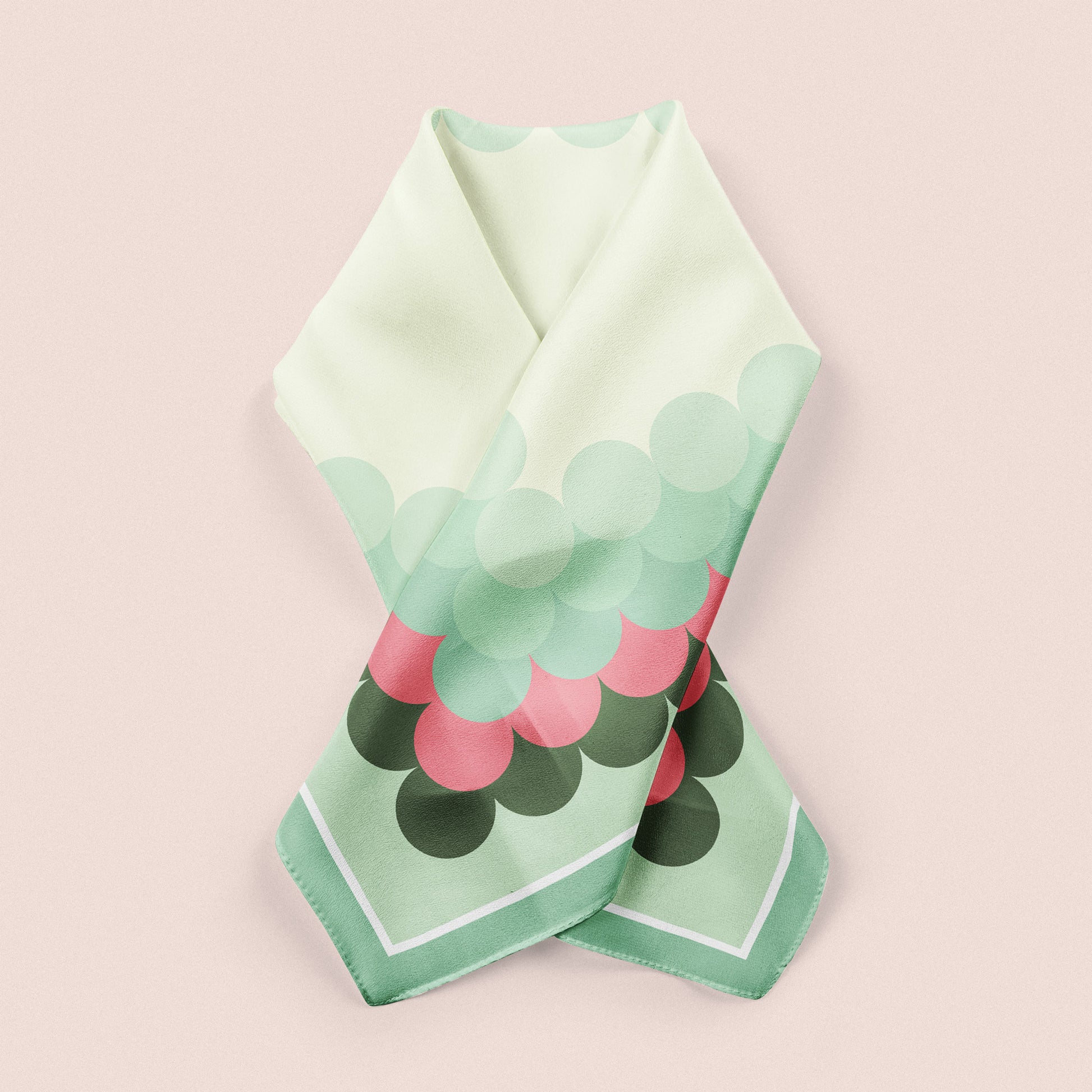 Meet my Linear Dots mid century neckerchief, a retro 100% silk retro scarf with geometric mod print in green and pink.