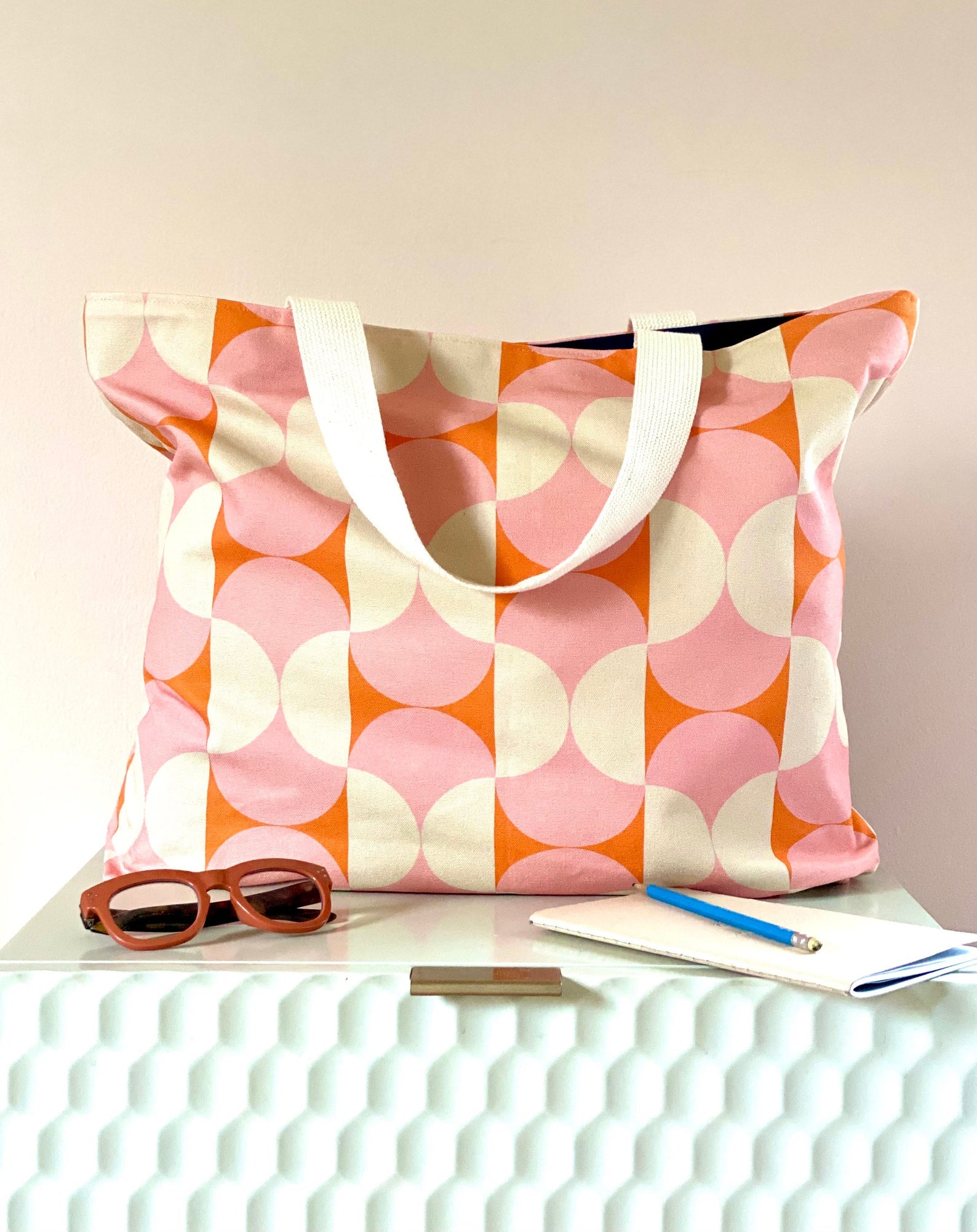 Meet the Mod Pod beach bag, a pink and orange retro mod print on the versatile oversized canvas bag - great for gym, travel, market... this bag has a zillion uses.