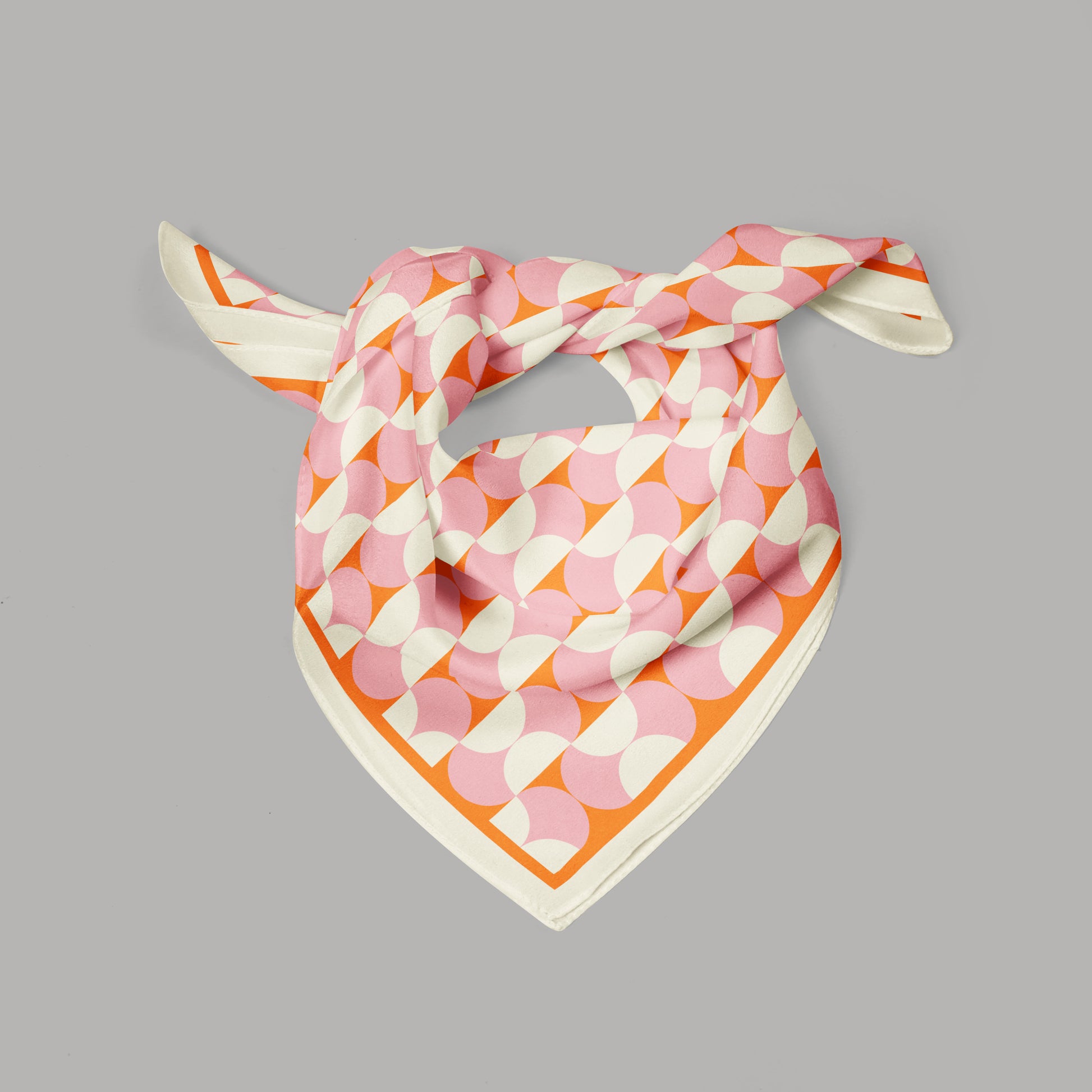 Meet my mid century neckerchief, a 100% silk retro print scarf with abstract shapes in yellow, white, and pink.