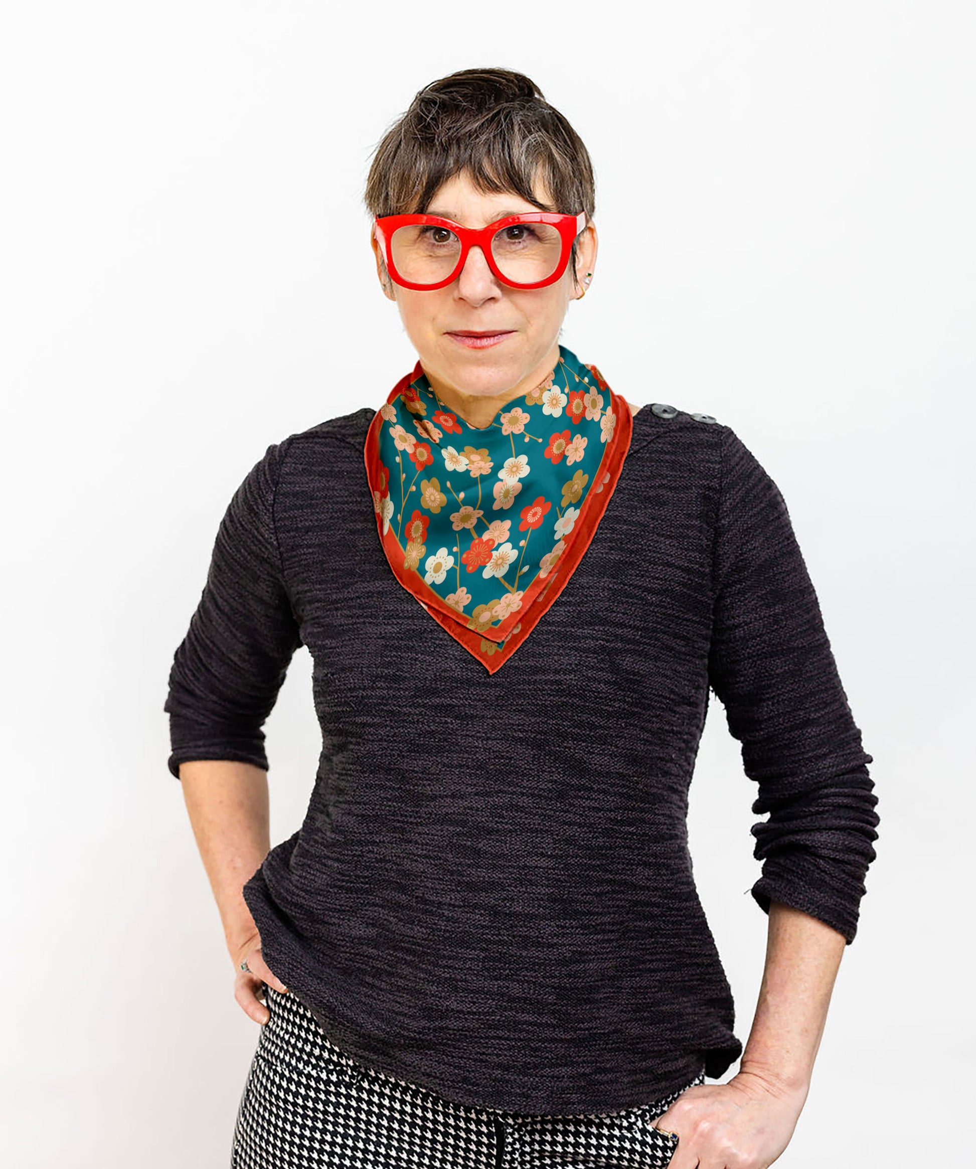 Meet Origami, inspired by tenugui (printed handkerchiefs) and origami paper that I played with as a kid. A 100% silk retro print scarf with red, white, and gold florals on a teal background.