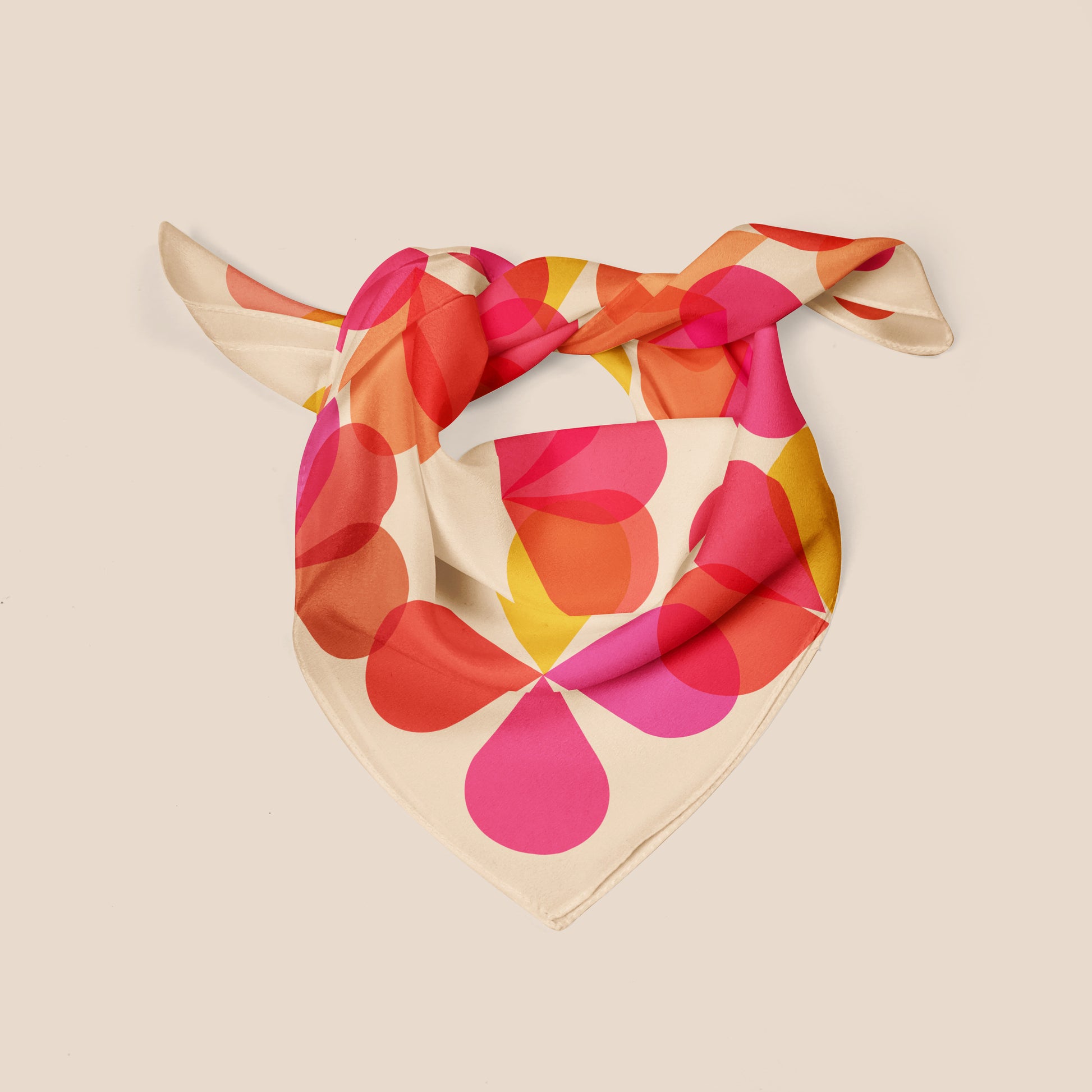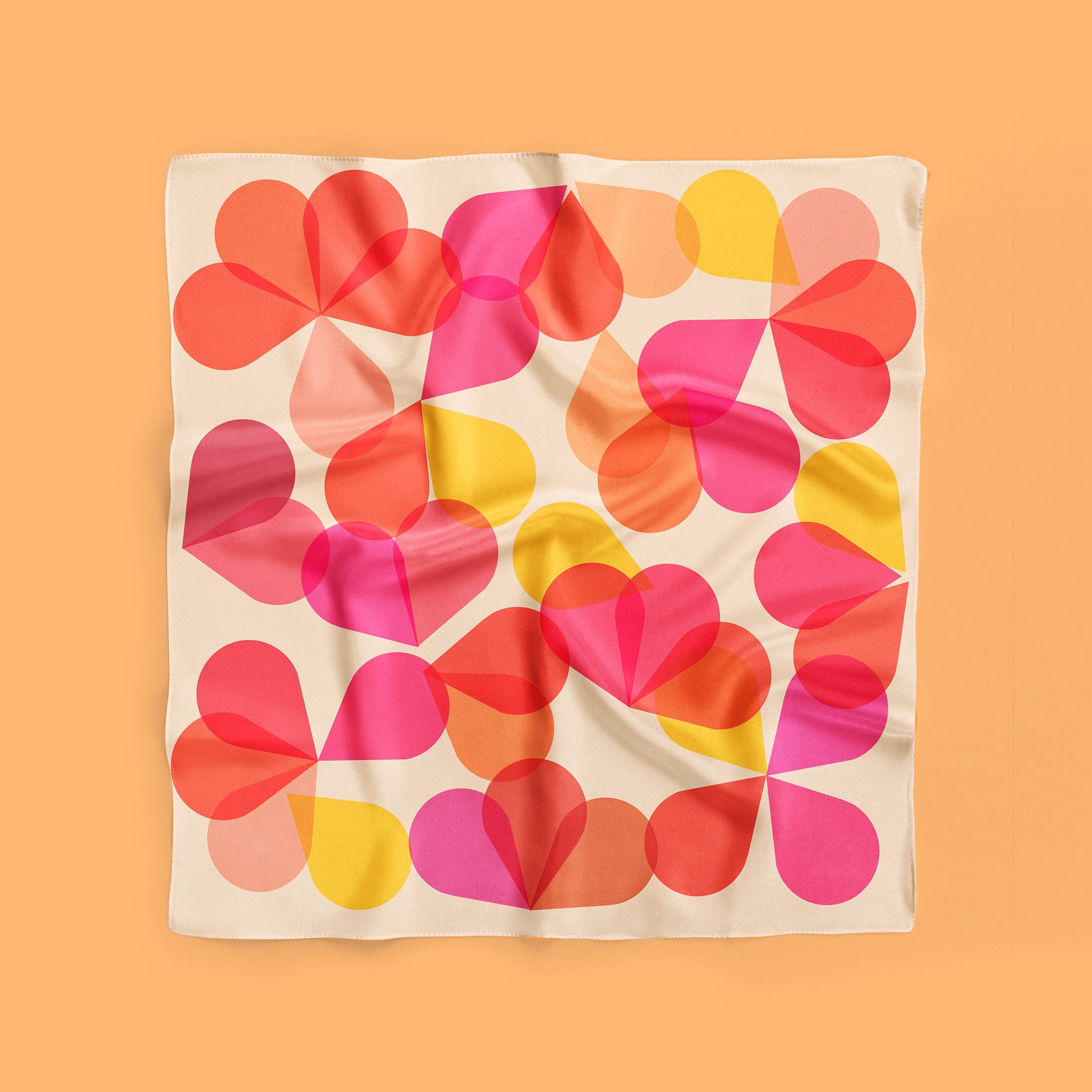 Meet Petals, a cheerful abstract floral square scarf, this 100% silk flower neckerchief has pink, red, yellow, and orange petal shapes.