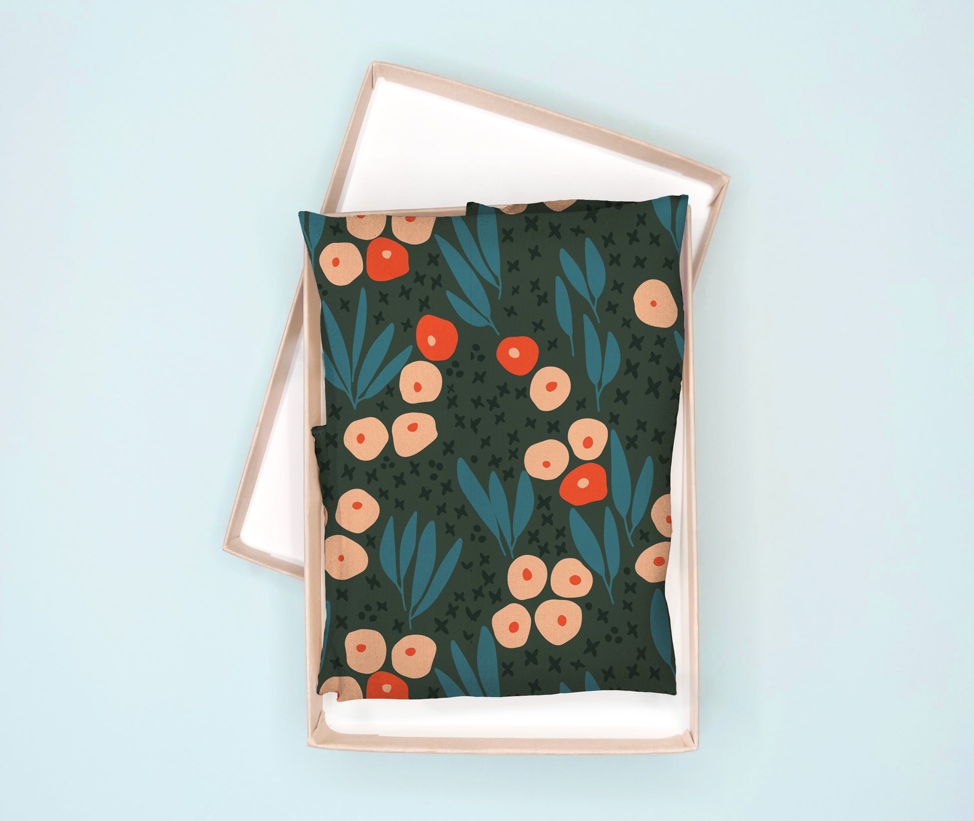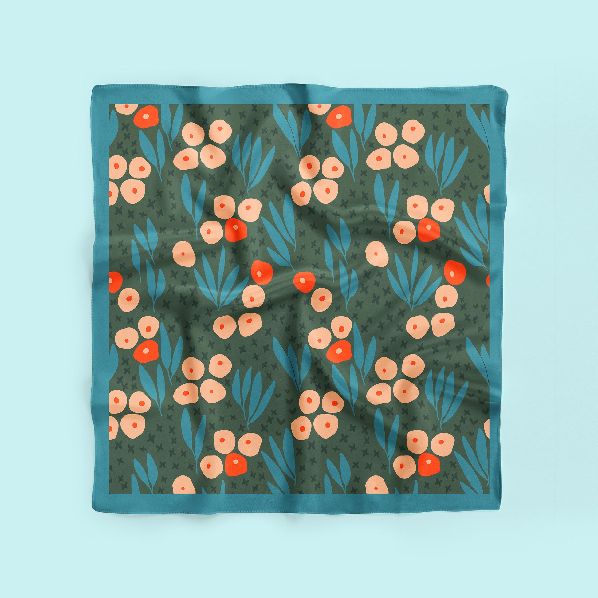 Meet my Scandiavian inspired flower and leaves pattern in blue, green, orange and peach - a 100% silk Nordic print scarf.