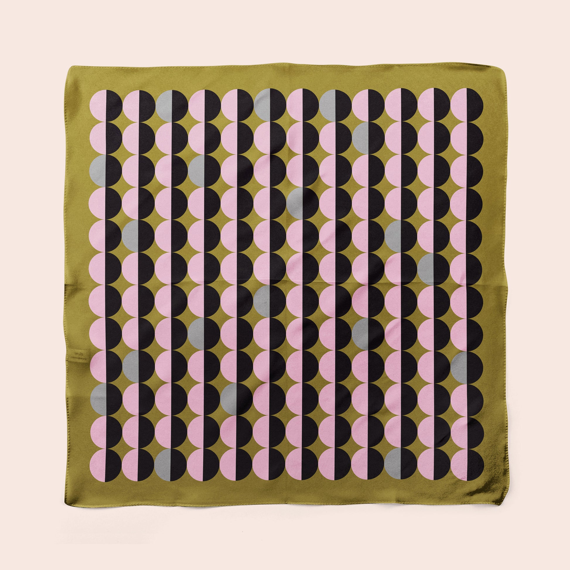 Meet Tablet - good for challenging situations. A square silk scarf printed on rich silk charmeuse, this 26" x 26" neckerchief with my geometric semicircle grid of pink half moons on olive green. A retro geometric print that's flattering and easy to wear.