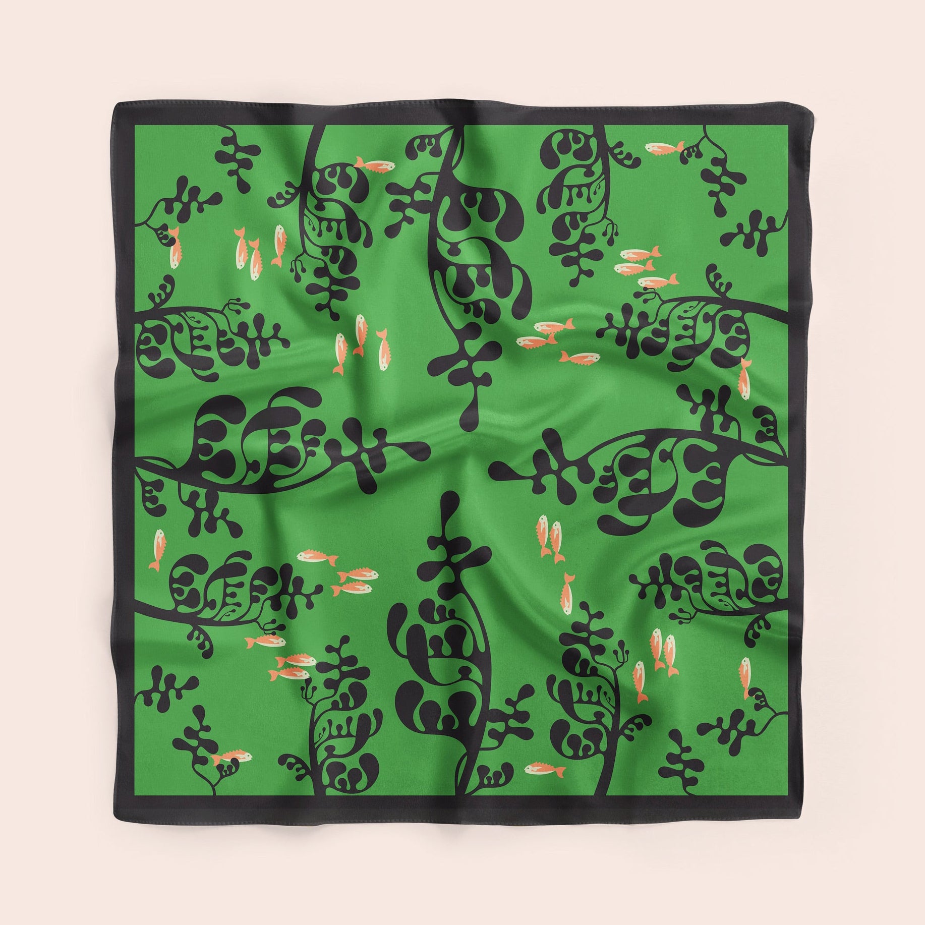 Curious pink fish explore some voluptuous seaweed in Under Water. Printed on rich silk charmeuse, this 26" x 26" scarf in rich green and black.